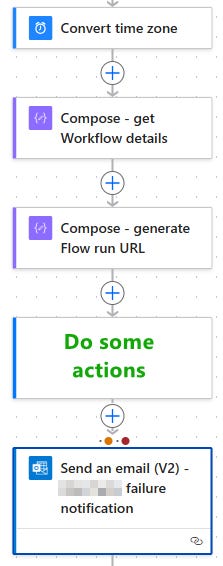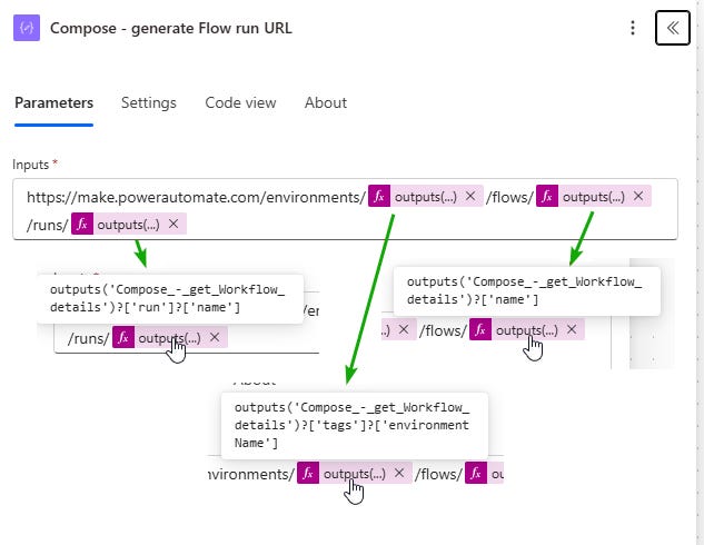 My first step above is getting the current time of the flow run (via utcNow()) just in case the timing may be helpful in other troubleshooting or investigation before opening the actual flow run history. This is totally optional, and you can skip this if you just want the URL.
