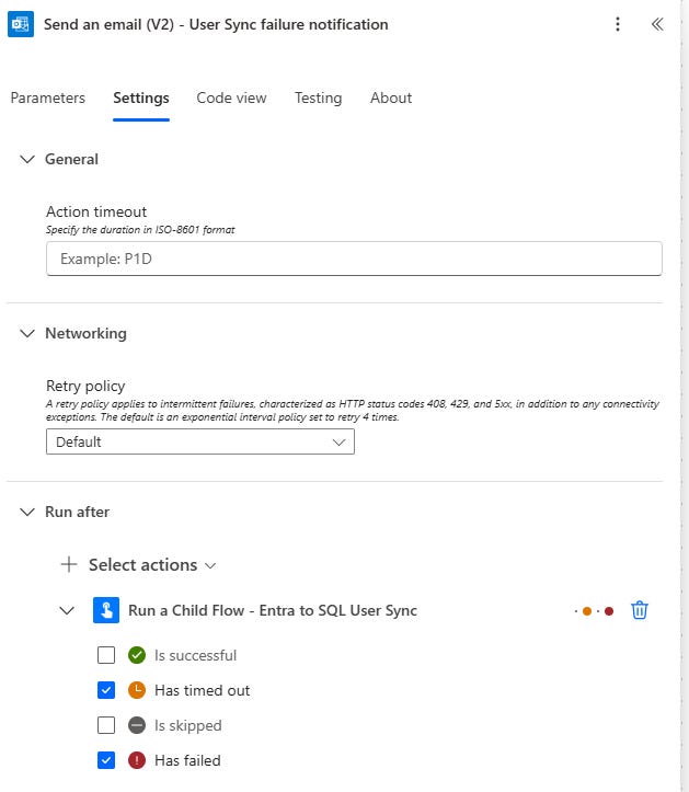 And finally, let’s configure a Send Email action when a previous step fails or times out. In this example I’m triggering the email off of the running of a child flow, but you can use the same idea for the parent flow or your standalone flow itself. You can also use the Scope action to integrate Try-Catch grouping for handling errors and notifications, but that is out of the scope of this quick article.
